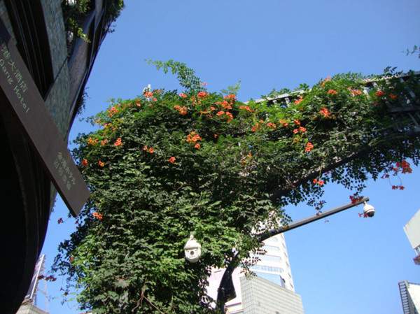 凌霄長勢非常快,應(yīng)用于棚架在較短的時(shí)間內(nèi)就能起到遮陰的作用,其紅花綠葉,是夏季一道亮麗的景觀,人們在棚下休憩,倍感清爽。