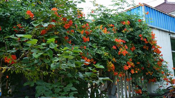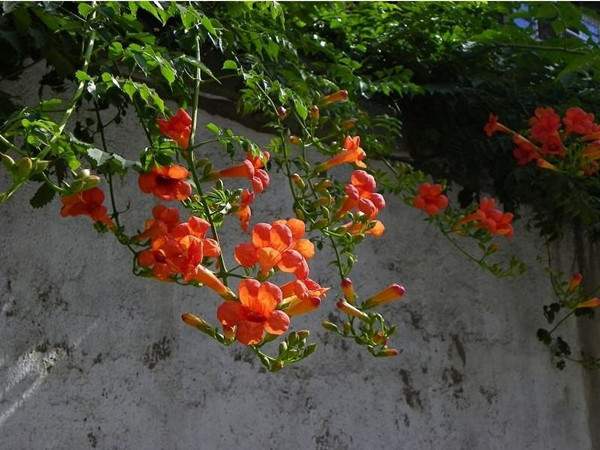不管是仿古墻還是鐵藝墻,白墻也罷,黑柵欄墻也罷,種植一些凌霄,使其纏繞或攀援其上,可有效柔化墻體,使得籬垣更富有生機(jī),美不勝收。