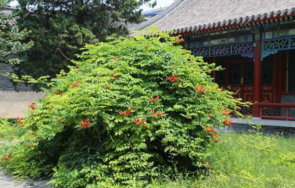 凌霄具有較強(qiáng)的攀援能力,將其栽植于建筑物的西山墻,幾年時(shí)間,便可爬滿墻體,不僅起到了綠化美化作用,還可有效降低夏季的室溫。花開之時(shí),滿墻紅花,好似花瀑一般,隨風(fēng)搖曳,美輪美奐。